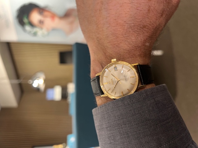 Omega de Ville Seamaster van het huis Türler uit Zwitserland. Een speciale uitgave dus van een mooi heren polshorloge van 18 krt goud met een originele lederen band en gesp van Omega.